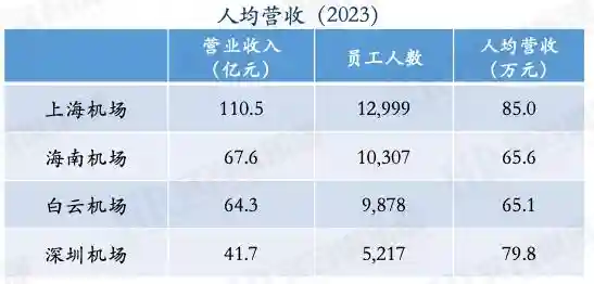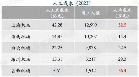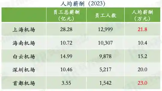 2025年,首都机场和上海机场,员工薪酬大约22-23万;白云机场和宝安机场是15万,海南机场是10.4万。