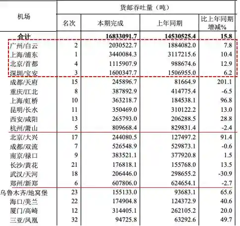 如果按照货物吞吐量,排位略有变化,前四名分别是:浦东、白云、宝安、首都。