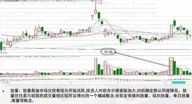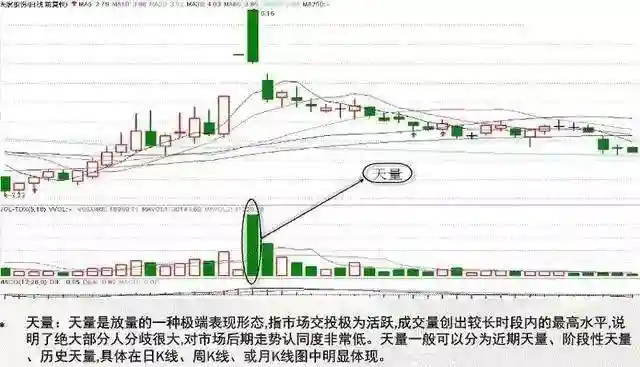 4、天量:是放量的一种极端表现形态,市场交投极为活跃,成交量创出较长时间段内的最高水平。