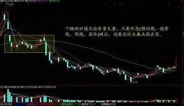 下跌的时候无论有量无量,只要形态(移均线,趋势线,颈线,箱体)破位,均要及时止赢止损出局。
