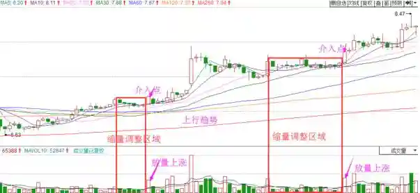 上图中的股价处于震荡上行中,我们可以很直观的看到,股价在上行一段时间后就出现一段调整期,在该调整期内出现了“价跌量减”的现象,之后出现了放量上涨一改之前的调整趋势,开始了新一轮的上行,我们可以在放量上行当日考虑介入。如上图,若我们在低位的介入点介入,那么我们的收益更是不用说了。之后再出现第二次相似的调整,这是给那些还未介入的投资者提供的绝佳机会。它的调整逻辑和前期调整逻辑一样。