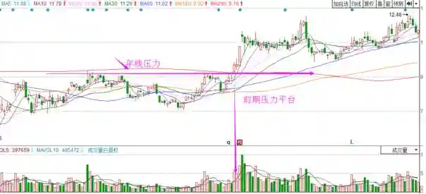 上图中股价震荡上行,两次在几乎相同的位置股价回调,但之后成交量开始放大,不仅突破了前期压力平台,还突破了年线的压力站上年线。之后股价继续延续震荡上行的趋势。在这样的情况下,我们选择突破阻力作为入场点,是在确认了多空双方的力量情况下而选择的策略,比较安全。如上图,就可以选择当股价突破年线时入场,那么我们即便是做短线其收益也是诱人的。