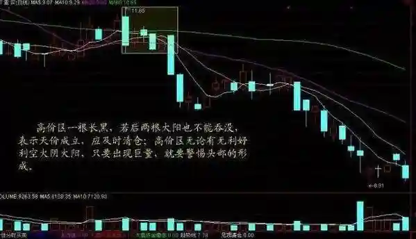 高价区一根长黑,若后两根大阳也不能吞没,表示天价成立,应及时清仓;高价区无论有无利好利空大阴大阳,只要出现巨量,就要警惕头部的形成。