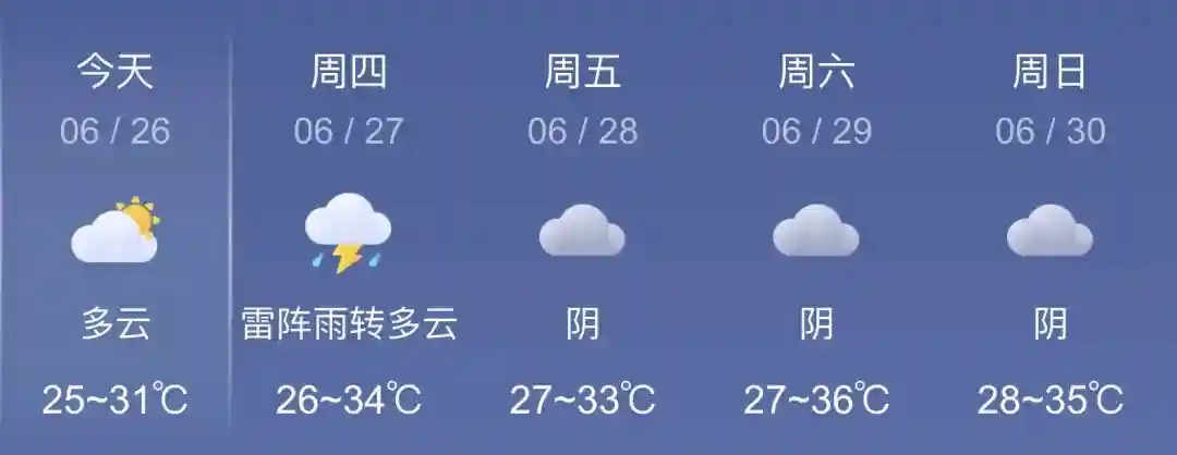 多云,25~31℃,微风