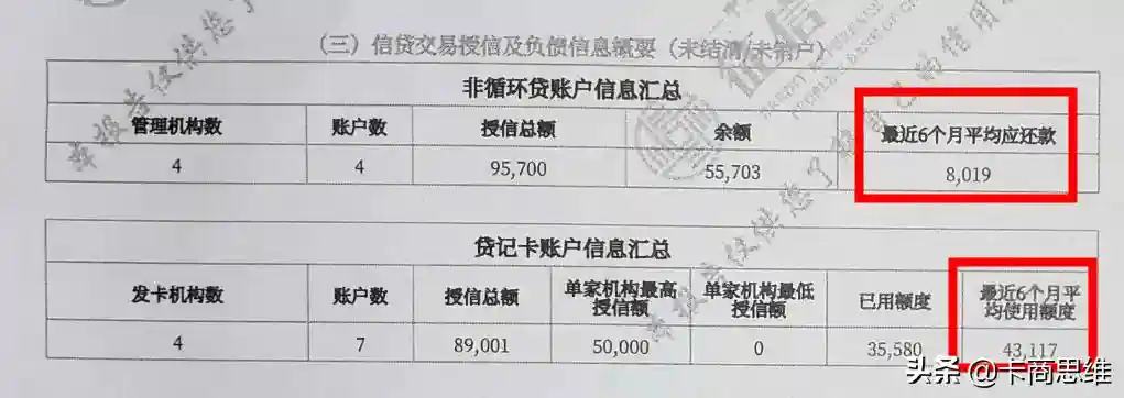 我们来看下负债,主要看贷款的最近6个月平均应还款,和信用卡的最近6个月平均使用额度,我们来计算下负债率: