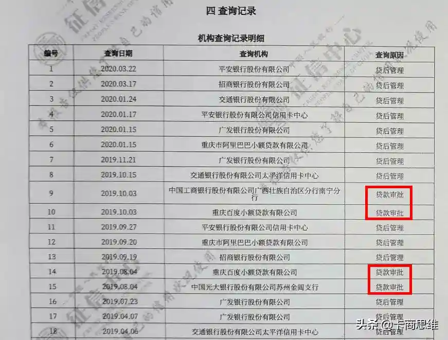 如果你的查询记录满满的都是硬查询,信审员就有理由怀疑存在多头授信、以卡养卡嫌疑。