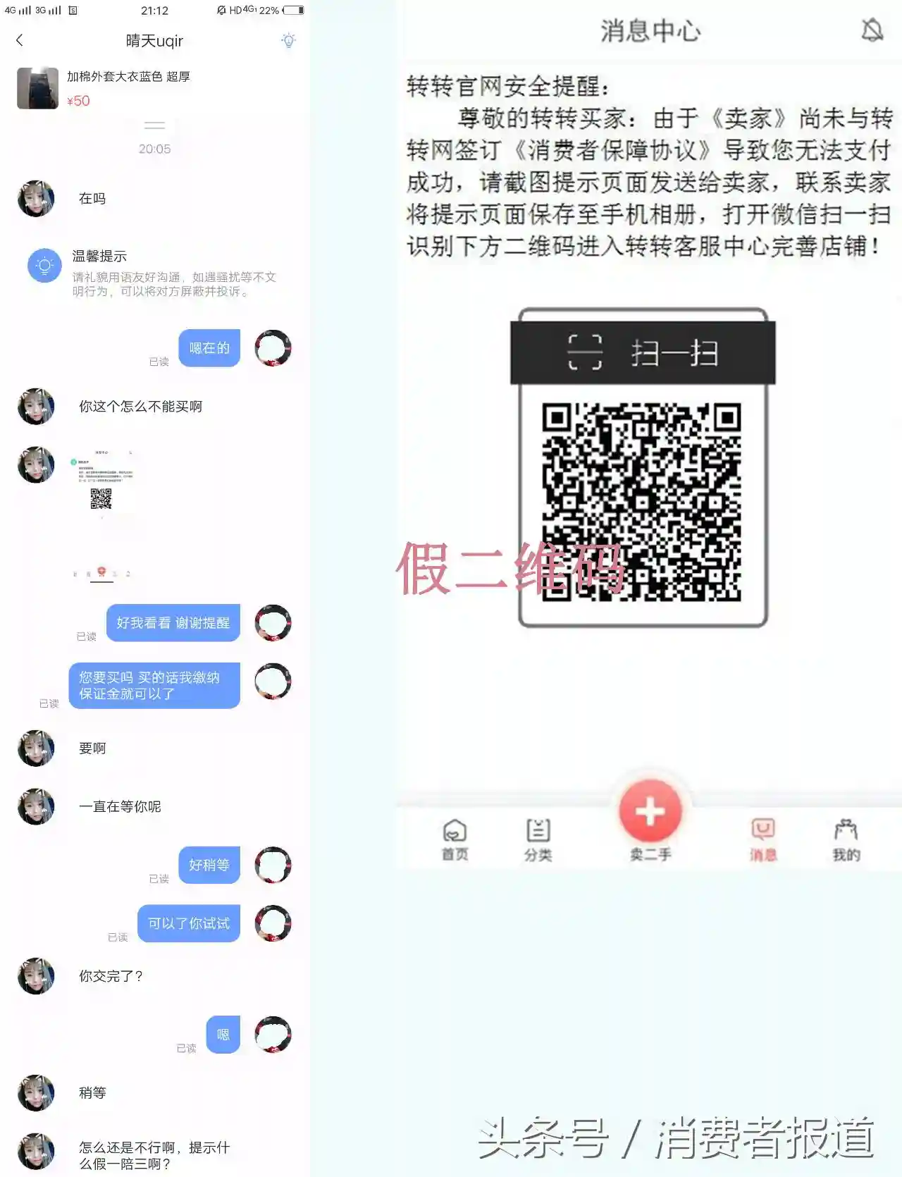 秦先生告诉《消费者报道》,他在转转平台发布信息后,从微信通知助手收到“认证信誉卖家”的信息:认证后可以提高商品曝光率,并可在相应页面内退款。由于平台未对通知做出特殊说明,他误以为是官方活动,遂缴纳500元保证金,收款方为“转转精神科技有限公司”,但付款后发现收款方(转转)未履行相应的承诺并无法退款。电联客服却表示查不到他的订单,无奈之下,秦先生只能通过通知助手的信息联系一个私人QQ号。不过,该客服表示,自己并非转转客服,只是管理商家的转转运营人员,无法操作退款。争执后消费者收到了退款。