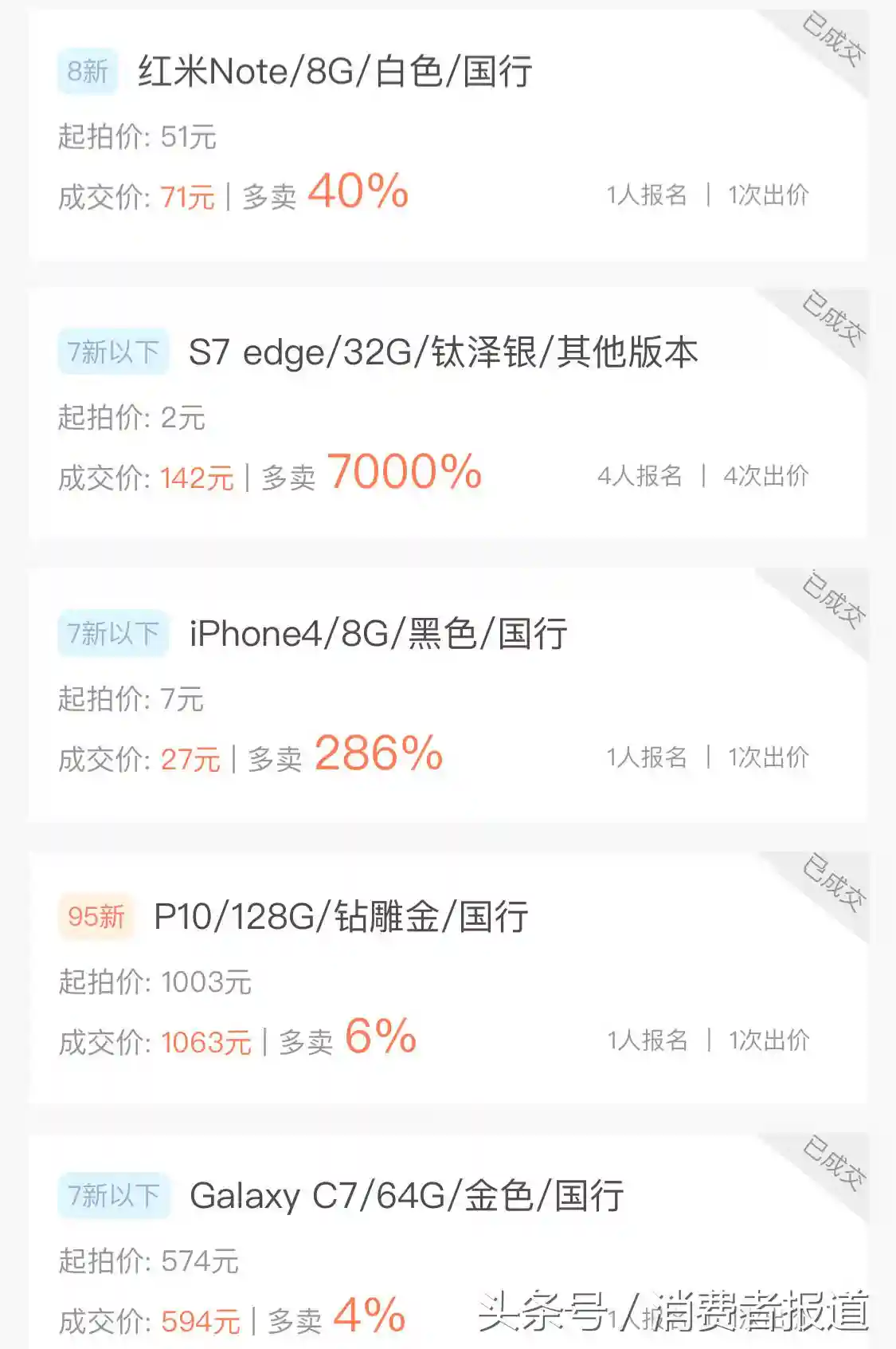 查看转转APP的手机保卖历史成交记录,可以发现除了iPhone、小米等新款热门手机有较多人参与竞拍外,常出现低于5人的竞拍,甚至有大量手机仅1人出价。