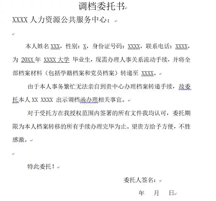 正常调档是需要本人携带公司开的调档函亲自到存放档案的人才中心提供相应证件材料做档案提取申请,如果本人不方便可以写一个调档委托函,我当时是委托我父亲去人才中心做的提档,调档一般可以选择是自提还是机要邮寄两个途径,但是都需要提供一个调档函,调档函是公司开的,委托函的格式可以参考下面的文档:
