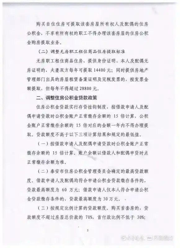 ②泰安市住房公积金管理委员会确定的最高贷款额度。借款申请人及配偶均符合申请公积金贷款缴存条件的,贷款最高额度为60万元;借款申请人仅本人符合申请公积金贷款缴存条件的,贷款最高额度为30万元。